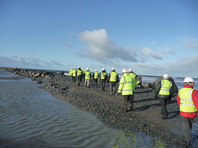 Ceredigion County Council Scrutiny Committee visited Borth Coastal Protection Scheme Phase 1 on Thursday 19th January 2012. Ray Jones, Area Agent for the Contractors (Bam Nuttall), Alice Johnson, Civil Engineer (Royal Haskoning) and Ray Quant (Ceredigion County Council, Council Cabinet Member) Answered questions after which they walked out to sea at low tide along the temporary Causeway to see work in progress on the North & South Reefs, before the rock, and shingle causeway is completely removed to finish off Rock Breakwater No 1, and Shinge Nourishment at the South end of the beach. They also walked North along the beach to see the completed Rock Breakwaters, Rock Groynes and Shingle Nourishment. Phase 1 is expected to be finished in March 2012. Weather permitting!